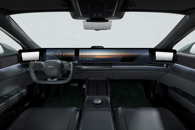 Nội thất bền vững gao gồm vô-lăng chữ Y, cánh gió sau chủ động và camera bên thay gương chiếu hậu. Bảng điều khiển nổi bật với hệ thống màn hình toàn cảnh từ Sony, cung cấp bản đồ 3D, giải trí đa dạng, cập nhật OTA, trợ lý kỹ thuật số (Afeela Personal Agent), kết nối 5G và hỗ trợ chơi game từ xa với PlayStation 5.