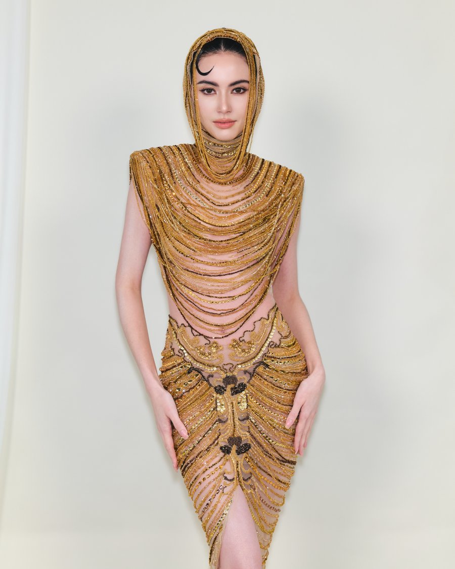 Thiết kế lấy cảm hứng từ nghệ thuật và hoa văn văn hóa Champa, nổi bật với chi tiết đính kết tinh xảo, tạo nên hiệu ứng thị giác rực rỡ dưới ánh đèn sân khấu. Bộ váy không chỉ tôn lên vẻ đẹp quyến rũ và sang trọng của Davikah, mà còn góp phần mang đến thông điệp về sự giao thoa văn hóa trong ngôn ngữ thời trang đương đại.