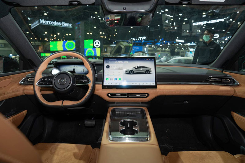 Khoang lái của Mazda 6e được thiết kế tối giản nhưng không kém phần sang trọng với các trang bị cao cấp như ghế bọc da Nappa màu nâu với ghế lái chỉnh điện 8 hướng, ghế hành khách chỉnh điện 4 hướng. Ghế trước có chức năng sưởi, thông gió và massage. Hệ thống đèn nội thất 64 màu.