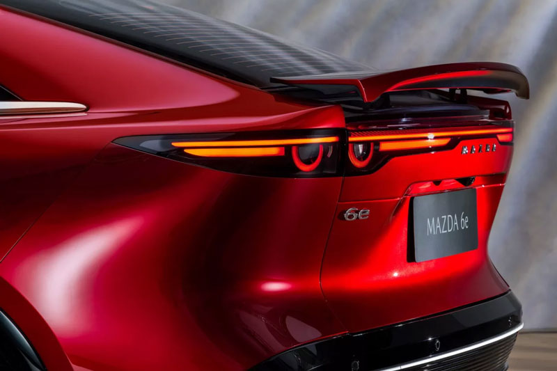 Mazda 6e mang phong cách tối giản nhưng đầy tinh tế với đèn pha LED tự động điều chỉnh chùm sáng cao-thấp, logo phát quang điện tử 3D, tay nắm cửa điện ẩn và cửa không khung. Mâm xe hợp kim 19 inch đi kèm lốp Michelin 245/45 R19. Cửa hậu chỉnh điện cùng hệ thống gạt nước tự động.
