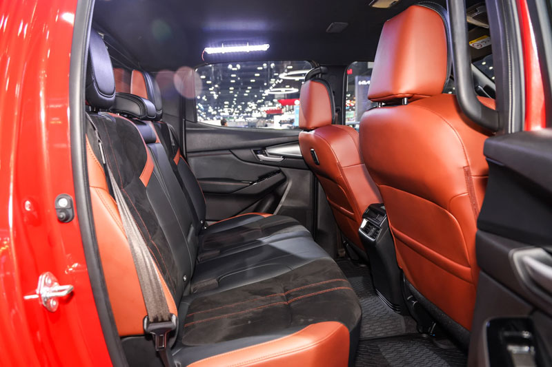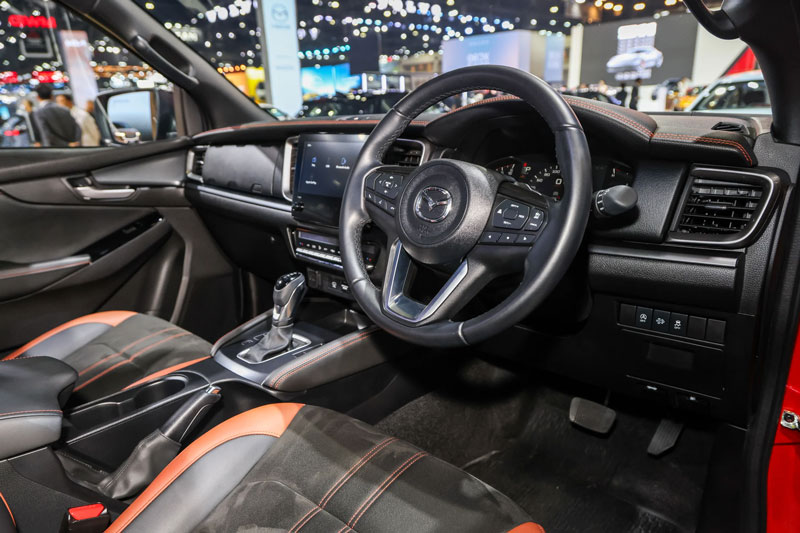 Phiên bản cao cấp nhất được trang bị ghế bọc da màu đen kết hợp với chất liệu Maztex và da lộn tổng hợp màu đất nung, mang đến cảm giác sang trọng và thể thao. Tựa đầu ghế trước còn có đường chỉ thêu "BT-50", tạo điểm nhấn độc quyền cho phiên bản mới này.