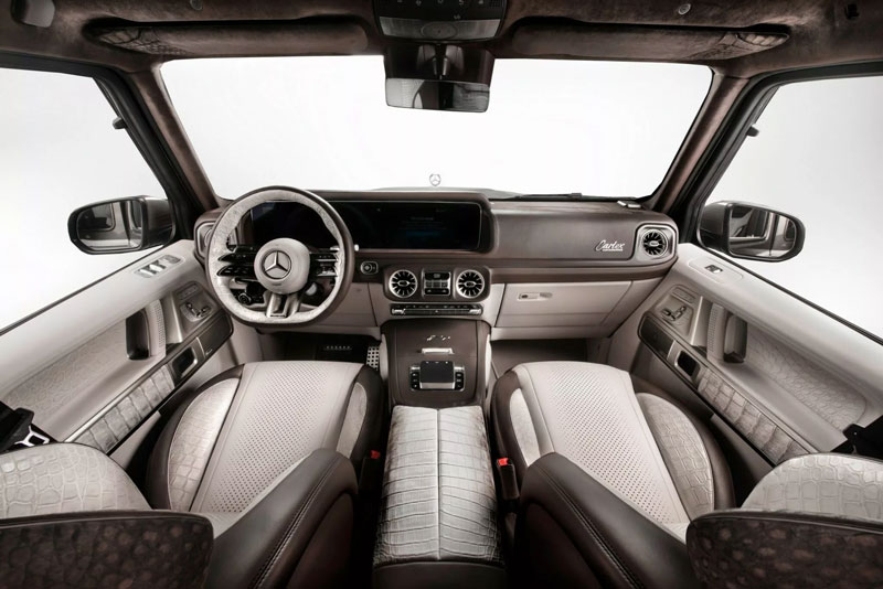 Bước vào khoang cabin, Carlex tiếp tục chứng minh lý do vì sao chiếc xe này có giá lên tới hàng triệu đô la. Toàn bộ ghế ngồi được bọc bằng da cá sấu Himalaya cao cấp - loại da nổi tiếng từng được sử dụng trên túi xách Hermès Birkin với giá hàng trăm nghìn USD mỗi chiếc. Sự xa xỉ này tiếp tục hiện diện ở từng chi tiết nội thất, từ da nâu và trắng cao cấp phối hợp tinh tế, cho đến trần xe bọc Alcantara mềm mại, mang lại cảm giác vừa sang trọng vừa độc nhất vô nhị.