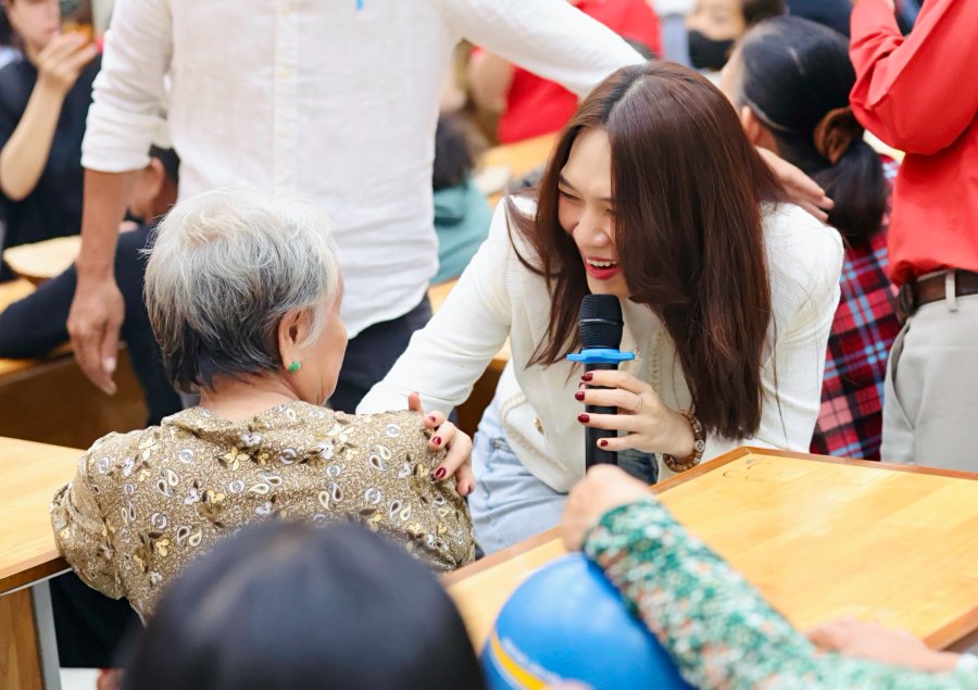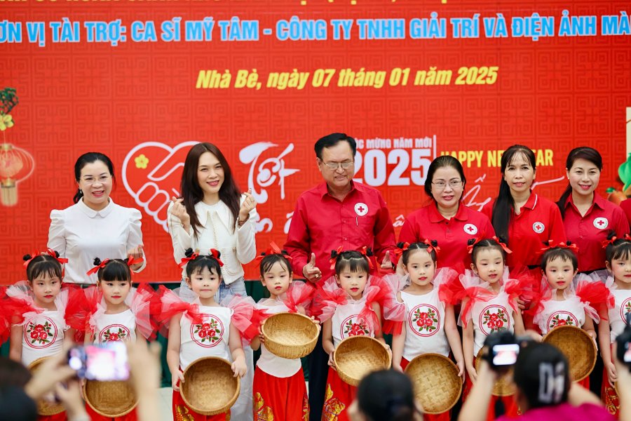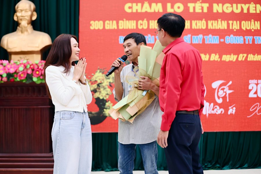 Mỹ Tâm chia sẻ với bà con tại buổi trao quà: “Đây là lần đầu tiên con đến trực tiếp huyện Nhà Bè để thăm cô chú. Con cũng thường trao tặng quà cho các cụ già neo đơn, cô chú lớn tuổi gặp khó khăn vào mỗi năm. Hôm nay, con rất vui được gặp gỡ bà con, đồng thời gửi bà con phần quà Tết và phong bì lì xì để bà con có một cái Tết thật đầm ấm.”