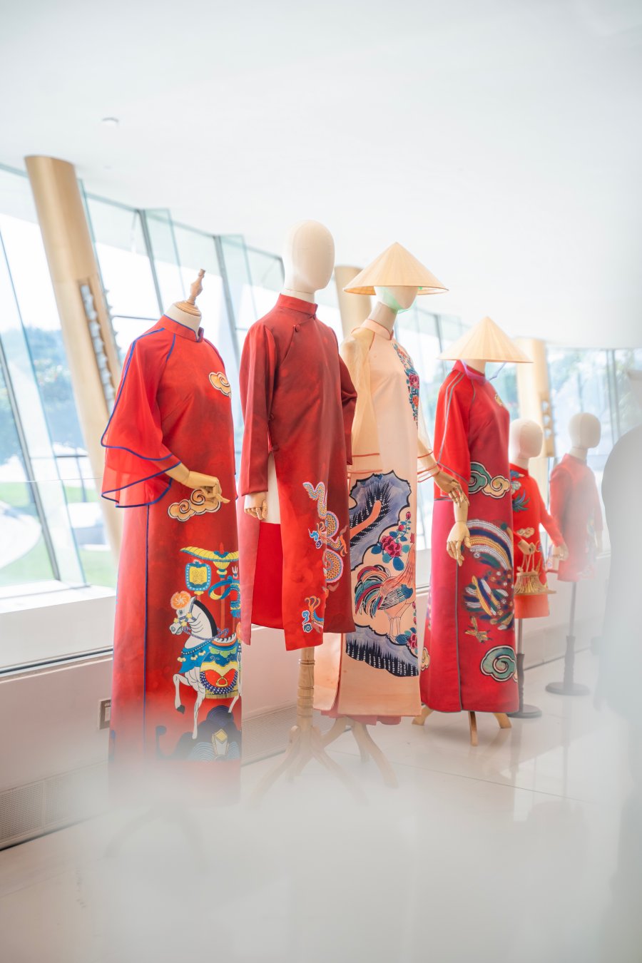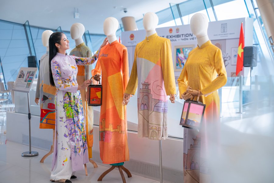 Trong phần phát biểu tại khai mạc triển lãm, Ngọc Hân bày tỏ lý do cô mang 5 bộ sưu tập áo dài có sự kết hợp với mỹ thuật đến Dubai. Đầu tiên là bộ sưu tập “Tranh Kim Hoàng” nhằm tôn vinh dòng tranh dân gian xuất hiện từ thế kỷ 18-19 của Việt Nam. Bộ sưu tập áo dài tái hiện nét đẹp của loại hình nghệ thuật từng thịnh hành trong lịch sử văn hóa dân tộc với bảng màu rực rỡ đặc trưng: từ đỏ hiên, đỏ điều, đỏ sen đến vàng yến - những sắc màu gắn liền với không khí Tết cổ truyền.