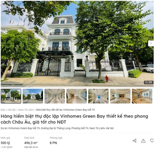 Mới đây, một căn biệt thự đơn lập thuộc dự án Vinhomes Green Bay (Nam Từ Liêm, Hà Nội) được rao bán với giá 500 tỷ đồng trên sàn giao dịch trực tuyến Batdongsan.com, tương đương 1,01 tỷ đồng/m2. So với mức giá mở bán 180 triệu đồng/m2 vào năm 2019, giá trị căn biệt thự đã tăng gấp hơn 5 lần.