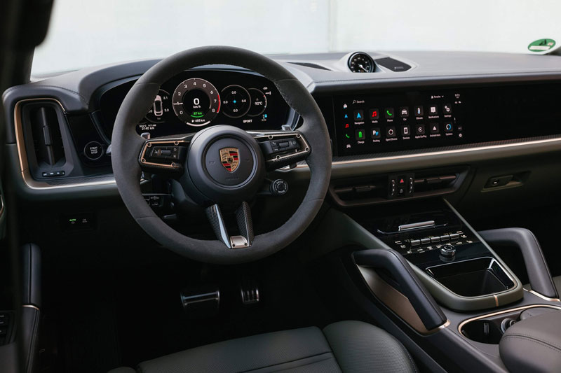 Điểm nhấn trong cabin của Porsche Cayenne S E-Hybrid Coupe là cụm đồng hồ kỹ thuật số cong kích thước 12,6 inch, màn hình giải trí trung tâm 12,3 inch, đi kèm gói Sport Chrono và đồng hồ thể thao Porsche Design cao cấp.