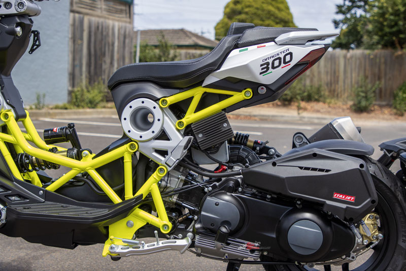 Với thiết kế gọn nhẹ, khung sương nhỏ, đặc biệt là chiều dài của trục cơ sở chỉ 1.345 mm - ngắn nhất trong phân khúc Italjet Dragster 300 2025có khả năng linh hoạt tối đa khi vận hành. Tuy nhiên, nhược điểm là sự linh hoạt và độ chính xác cao, nhưng nhược điểm là hệ thống treo cứng và gần như không mang lại sự thoải mái.