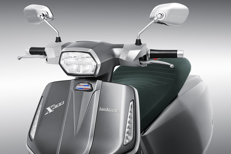 Về thiết kế, Lambretta X300 mang đậm DNA cổ điển pha trộn hiện đại, cực kỳ hút mắt ngay từ cái nhìn đầu tiên. Điểm nhấn chính là cụm đèn pha LED hình lục giác, thiết kế hai tầng độc đáo, được bao bọc bởi viền crôm sáng bóng đầy tinh tế. Dải đèn xi nhan kéo dọc theo chiều thân xe và chi tiết “mào gà” đặc trưng của Lambretta đặt ngay trên chắn bùn trước giúp X300 dễ dàng nhận diện giữa một “rừng” xe tay ga ngoài phố.