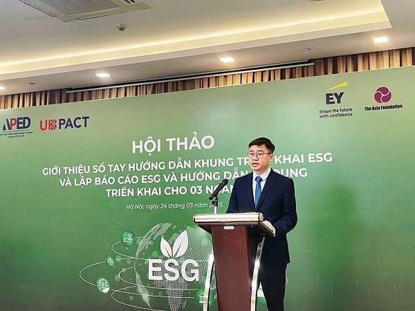 Sổ tay hướng dẫn khung triển khai ESG và lập báo cáo ESG được Cục Phát triển Doanh nghiệp tư nhân và Kinh tế tập thể (APED) phối hợp với Đại sứ quán Anh, Quỹ châu Á Việt Nam, Công ty TNHH Emst & Young Việt Nam công bố tại hội thảo "Giới thiệu Sổ tay hướng dẫn khung triển khai ESG, lập báo cáo ESG và hướng dẫn áp dụng triển khai cho ba ngành", sáng ngày 24/3.