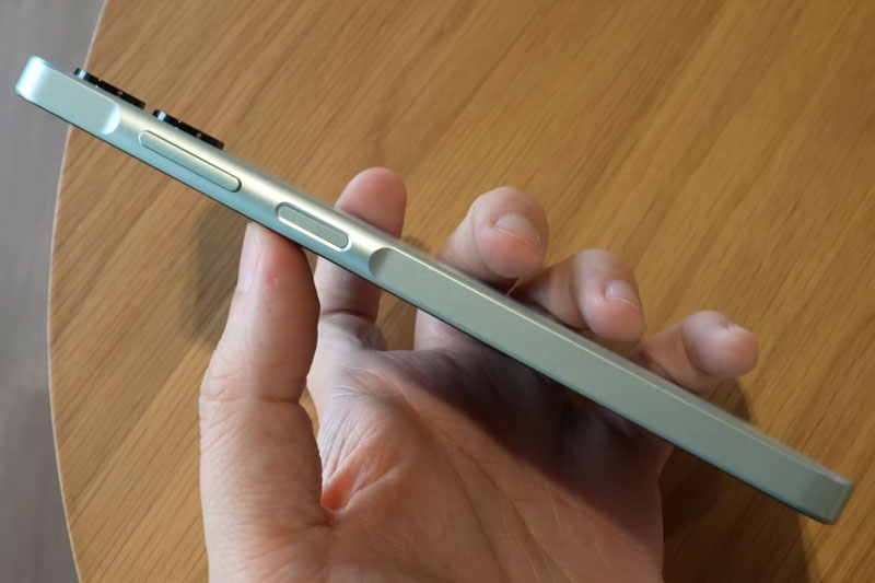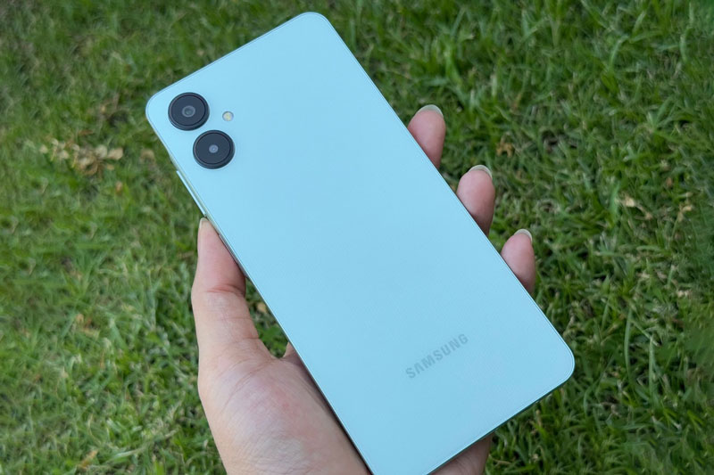 Kích thước của Samsung Galaxy A06 5G lần lượt là 167,4x 77,4 x 8mm, trọng lượng 191g. Cảm biến vân tay nằm ở nút nguồn bên cạnh phải. Điểm khác biệt so với phiên bản 4G là Galaxy A06 5G có khả năng kháng nước và bụi với chuẩn IP54.