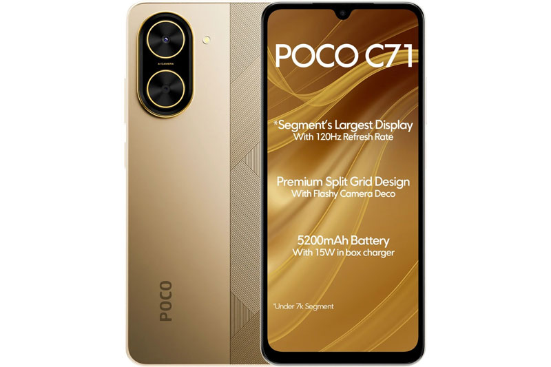 Xiaomi Poco C71 có ba màu cá tính gồm Power Black, Desert Gold và Cool Blue. Giá bán tại Ấn Độ khởi điểm từ 6.499 Rupee (tương đương 1,96 triệu đồng) cho bản 4GB + 64GB, trong khi bản 6GB + 128GB có giá 7.499 Rupee (2,26 triệu đồng).