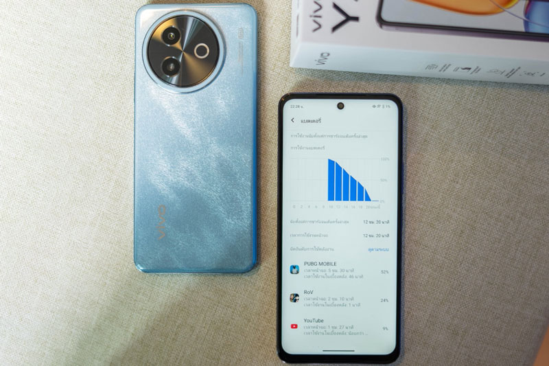 Y39 5G được trang bị viên pin 6.500mAh, đi kèm công nghệ BlueVolt giúp tối ưu hóa tuổi thọ pin. Máy hỗ trợ sạc nhanh 44W, cho phép sạc đầy pin trong thời gian ngắn, đồng thời hỗ trợ sạc ngược có dây. Vivo cũng cam kết bảo hành pin lên đến 5 năm thông qua chương trình Long Battery Health.