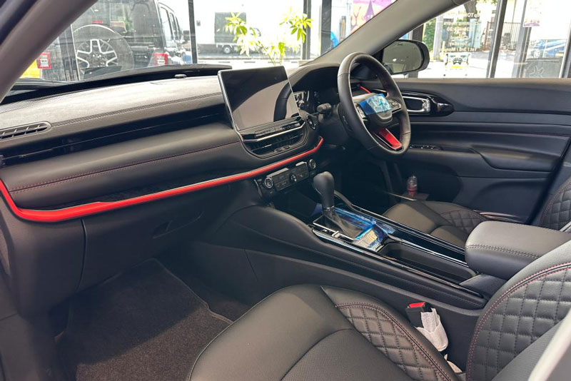 Bước vào khoang nội thất, phong cách đen - đỏ tiếp tục được thể hiện rõ ràng. Bảng táp-lô và vô-lăng xuất hiện dải trang trí màu đỏ, trong khi ghế ngồi bọc da tổng hợp màu đen được khâu chỉ đỏ tương phản và trang trí bằng họa tiết ngụy trang, mang lại không gian thể thao nhưng vẫn cao cấp, đúng chất Jeep.