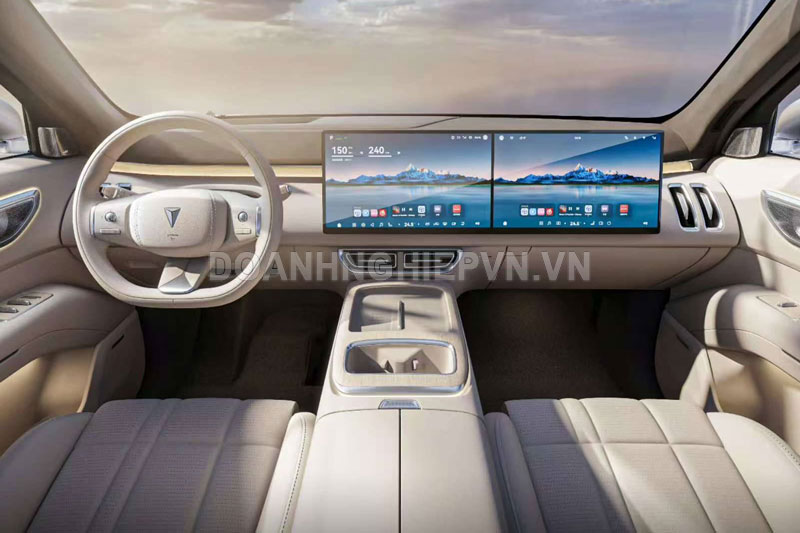 Bên trong khoang lái, Deepal S09 có thiết kế tông màu be nhạt ấm áp, vô-lăng ba chấu tinh tế và bố trí nội thất lấy cảm hứng từ Ideal L9. Điểm nhấn công nghệ của xe bao gồm bảng đồng hồ truyền thống bị loại bỏ, thay vào đó là màn hình AR-HUD hiển thị thông tin trực tiếp lên kính lái. Màn hình giải trí siêu lớn, kéo dài từ trung tâm đến tận ghế phụ lái.