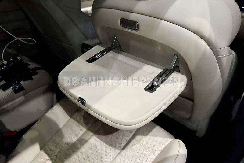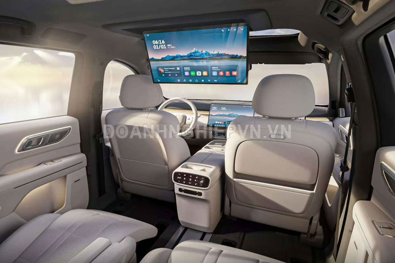 Một điểm đáng chú ý là Deepal S09 chỉ trang bị bàn gấp nhỏ ở ghế bên phải và có thêm màn hình giải trí gắn trên trần xe. Với các gia đình có trẻ nhỏ, tính năng này giúp tăng trải nghiệm giải trí, đặc biệt trong những chuyến đi xa.