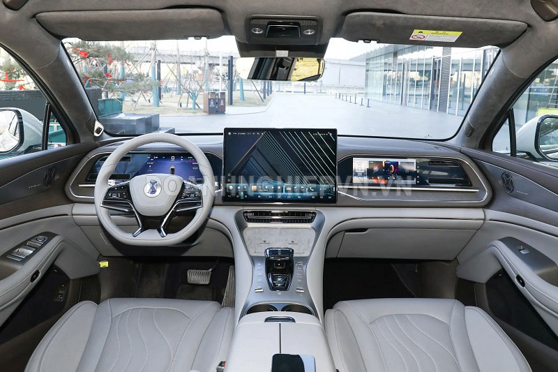 Bên trong cabin, Denza N7 2025 sở hữu bảng điều khiển trung tâm với thiết kế đường nét thẳng hiện đại. Xe được trang bị màn hình LCD 17,3 inch, cụm đồng hồ kỹ thuật số 10,25 inch, màn hình phụ lái 10,25 inch, màn hình AR HUD 50 inch và màn hình tựa tay phía sau.