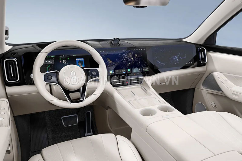 Bên trong khoang lái, Aito M8 mang đến hai tùy chọn cấu hình ghế ngồi gồm 2+2+2 và 2+3. Nội thất được trang bị hệ thống hiển thị thực tế tăng cường (AR-HUD) của Huawei và một màn hình cỡ lớn ba phần giúp tối ưu trải nghiệm người dùng. Cần số của xe được bố trí ngay sau vô lăng, giúp giải phóng không gian trên bảng điều khiển trung tâm.