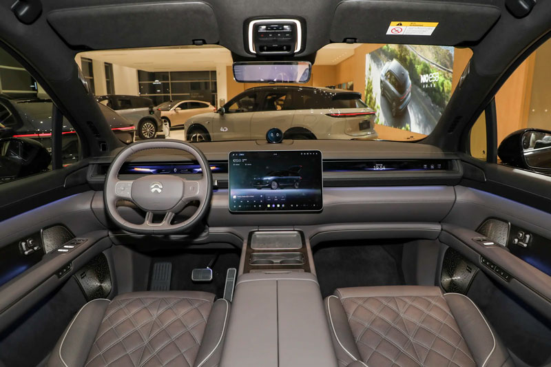 Khoang cabin của Nio ES8 2026 được đầu tư kỹ lưỡng với màn hình toàn cảnh Skyline, màn hình cảm ứng trung tâm đặt ngang, vô lăng ba chấu thế hệ mới và trợ lý ảo Nomi được nâng cấp. Các chi tiết gỗ thật, kim loại xước cùng đường chỉ thêu tinh xảo tới 120.000 mũi càng nhấn mạnh tính cao cấp.