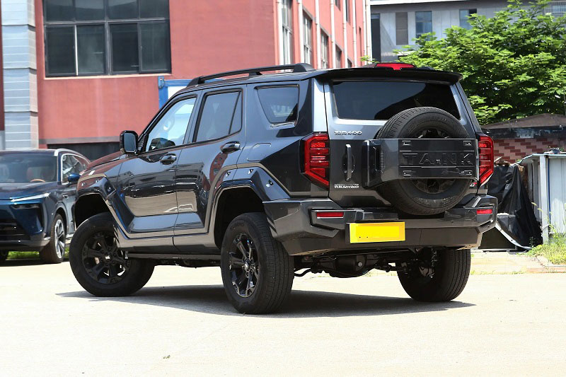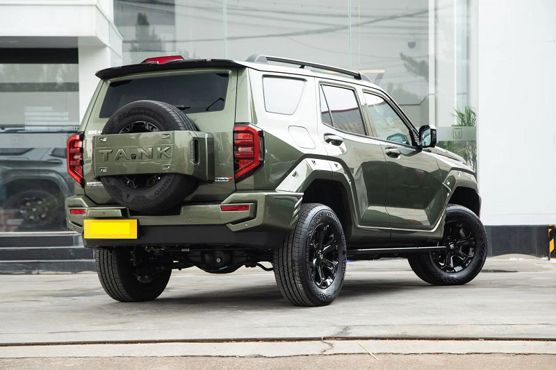 Di chuyển ra phía sau, lốp dự phòng vẫn được đặt ngoài nhưng phần tấm chắn đã được loại bỏ, logo “GWM TANK” và “Great Wall Motors” được đưa lên phía trên, còn tên phiên bản “Tank 400” và “Hi4-T/Hi4-Z” được bố trí phía dưới.