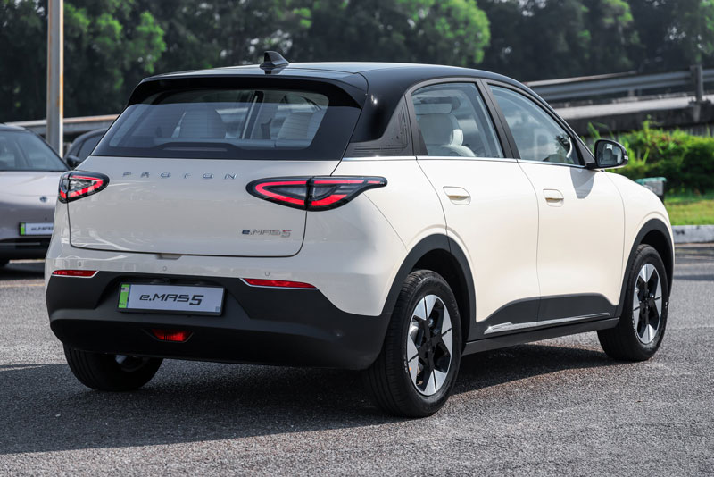 eMas 5 có kích thước dài 4.135 mm, rộng 1.805 mm, cao 1.580 mm, cùng chiều dài cơ sở 2.650 mm và khoảng sáng gầm 160 mm, mang lại dáng vẻ nhỏ gọn, phù hợp với đô thị. Trọng lượng xe ở mức 1.230 kg (Prime) đến 1.305 kg (Premium). Phiên bản Prime sử dụng mâm thép 15 inch, trong khi bản Premium sở hữu mâm hợp kim 16 inch thể thao hơn.