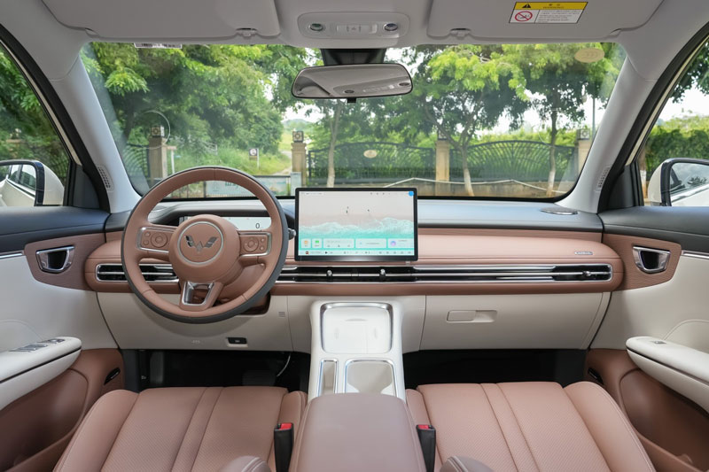 Không gian nội thất tiếp tục gây ấn tượng với thiết kế thẩm mỹ sống sang trọng, yên tĩnh, kết hợp tinh tế giữa sự hiện đại và ấm áp. Điểm nhấn nổi bật là màn hình cảm ứng giải trí 12,8 inch đặt nổi trên bảng điều khiển trung tâm, cùng cụm đồng hồ kỹ thuật số 8,8 inch và vô-lăng đa chức năng 3 chấu hai tông màu.