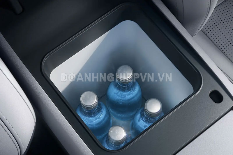 Xe cũng theo xu hướng cần số gắn trên cột lái, giúp tối ưu không gian trung tâm. Khu vực bảng điều khiển trung tâm được trang bị một cụm nút bấm vật lý, đế sạc điện thoại không dây và hai giá để cốc tiện lợi.Một điểm nhấn đáng chú ý là tủ lạnh tích hợp, có khả năng làm mát xuống -6°C hoặc làm nóng lên 50°C.