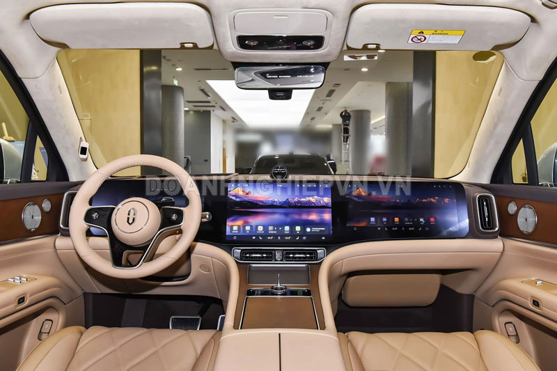 Bên trong khoang lái, Aito M9 2025 vẫn giữ thiết kế sang trọng với hai tùy chọn 5 hoặc 6 chỗ ngồi. Hệ thống giải trí trung tâm gồm ba màn hình lớn là màn hình LCD 12,3 inch cho bảng đồng hồ, màn hình chính 15,6 inch và màn hình hành khách phía trước 16 inch. Phiên bản mới được nâng cấp với hỗ trợ đùi chỉnh điện cho ghế lái, máy chiếu cải tiến và hộp lưu trữ có chức năng làm mát/sưởi ấm.