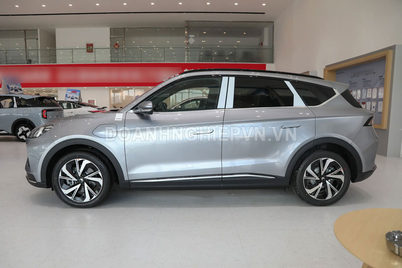 Nhìn từ bên hông, xe có thiết kế mui cong nhẹ kết hợp với giá để hành lý dày và vây cá mập, tạo cảm giác mạnh mẽ và chắc chắn. Tay nắm cửa dạng bật lên giúp giảm sức cản gió, trong khi viền bánh xe và ốp hông được trang bị các tấm nhựa đen dày, tăng thêm nét hầm hố cho xe. Mâm xe 5 chấu đường kính 19 inchmang phong cách thể thao, phù hợp với tổng thể thiết kế.