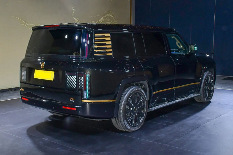 Logo phía trước và phía sau của Yangwang U8L Dingshi Edition được chế tác từ vàng 24K, thể hiện đẳng cấp thượng lưu. Xe sở hữu kích thước dài 5.400 mm, rộng 2.049 mm, cao 1.921 mm, chiều dài cơ sở đạt 3.250 mm. So với phiên bản tiêu chuẩn, U8L Dingshi Edition tăng thêm 81 mm chiều dài và 200 mm.