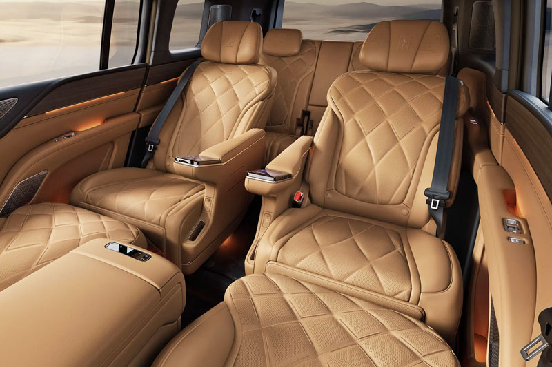 Logo trên vô-lăng cũng có thêm tuỳ chọn mạ vàng 24K nhằm gia tăng tính cá nhân hóa. Hàng ghế thứ hai gây ấn tượng với ghế không trọng lực tích hợp nút điều chỉnh ở hai bên cùng màn hình tựa tay trung tâm. Màn hình giải trí riêng ở tựa lưng ghế đã được thay bằng một màn hình trung tâm gắn trần.