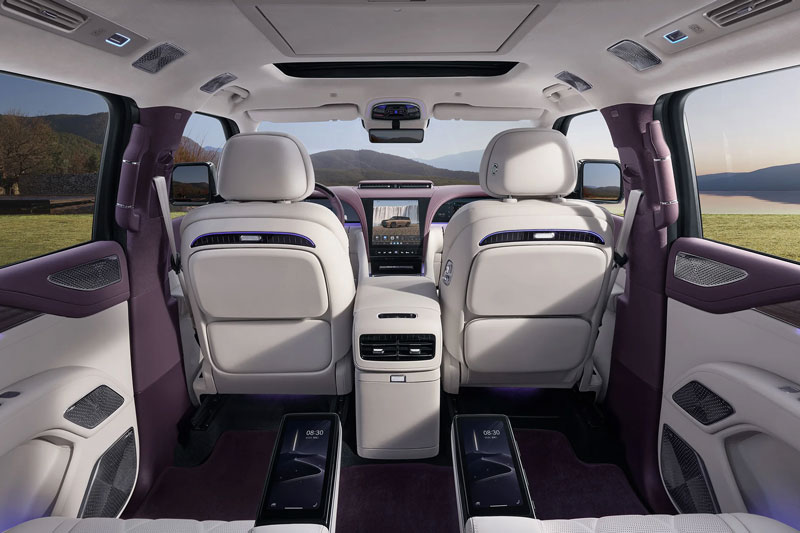 Ngoài ra, hàng ghế này còn có bàn gập hai bên, thiết kế ốp cửa mới, nâng cao sự tiện nghi và sang trọng cho hành khách. Xe cũng sở hữu kính chắn gió thông minh có khả năng tự điều chỉnh độ sáng, đổi màu tức thì, đồng thời chống nắng, cách nhiệt và ngăn tia UV hiệu quả.