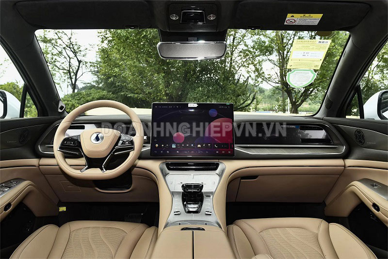 Bên trong cabin, Denza N7 2025 sở hữu bảng điều khiển trung tâm với thiết kế đường nét thẳng hiện đại. Xe được trang bị màn hình LCD 17,3 inch, cụm đồng hồ kỹ thuật số 10,25 inch, màn hình phụ lái 10,25 inch, màn hình AR HUD 50 inch và màn hình tựa tay phía sau.