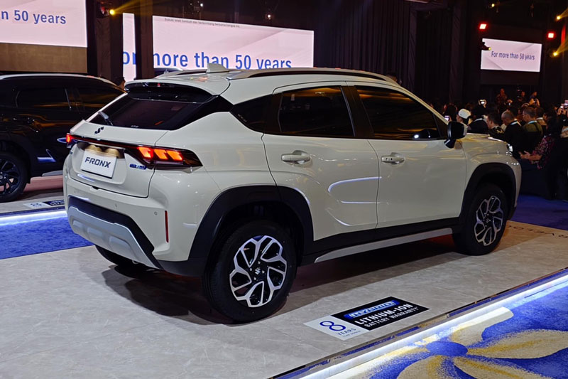 Về ngoại thất, Suzuki Fronx 2025 gây ấn tượng với mặt trước hầm hố và bóng bẩy, trang bị đèn pha riêng biệt kết hợp đèn LED và dải crôm nối liền đèn pha hai bên, cùng lưới tản nhiệt hình lục giác cỡ lớn và logo Suzuki ở trung tâm. Đèn chiếu sáng dưới dạng 3 bóng đặt cạnh nhau tạo hình tam giác đầy cá tính. Hông xe được thiết kế cơ bắp với vòm bánh xe mở rộng và các sọc đen trang trí bắt mắt. Phiên bản SGX sở hữu bộ mâm hợp kim đen 16 inch, trong khi các bản GX và GL đi kèm mâm hai tông màu 16 inch cùng lốp 195/60 R16.