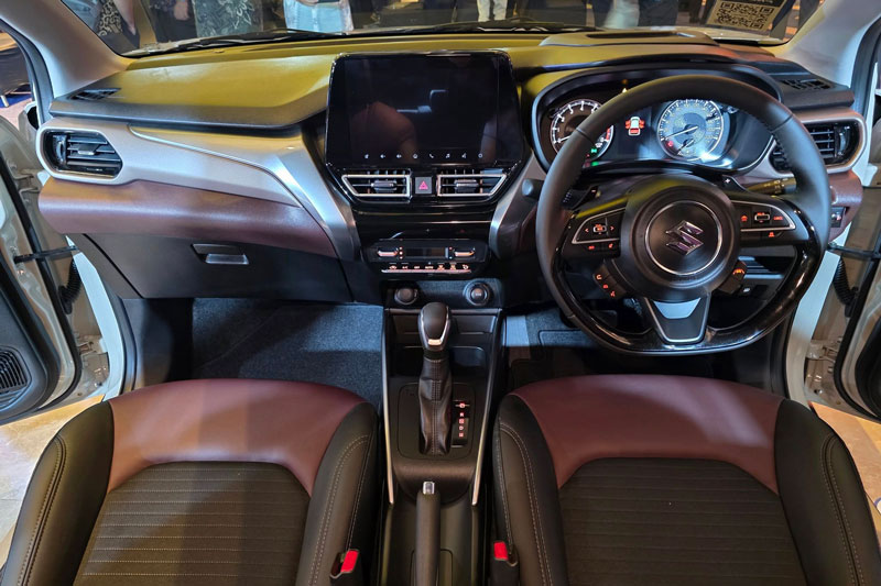 Khoang cabin của Suzuki FRONX được thiết kế trẻ trung với hai tông màu đen/nâu, đi kèm màn hình MID 4,2 inch phía sau vô-lăng đa chức năng đáy phẳng. Các phiên bản SGX và GX AT còn có lẫy chuyển số, giúp mang lại trải nghiệm lái thể thao hơn. Xe sở hữu màn hình cảm ứng 9 inch hỗ trợ Apple CarPlay, Android Auto và tích hợp màn hình HUD, cùng hệ thống sạc không dây, điều hòa tự động, cửa gió cho hàng ghế sau và cổng USB Type A và Type C.