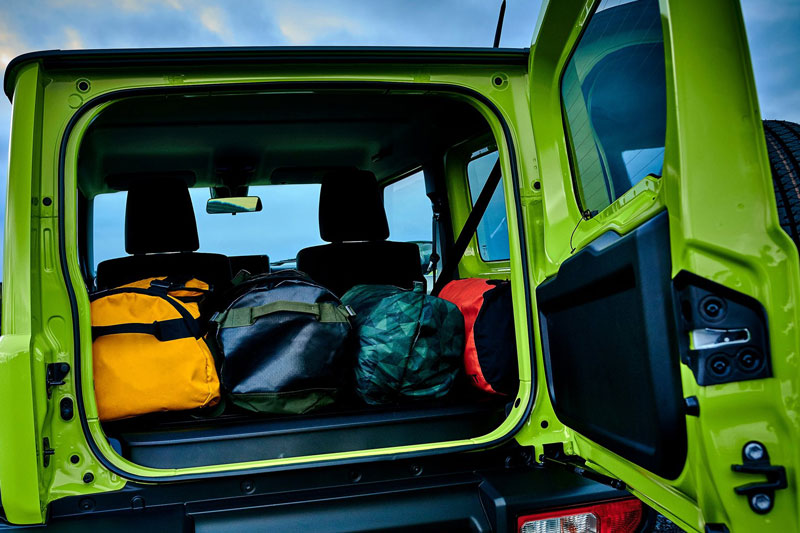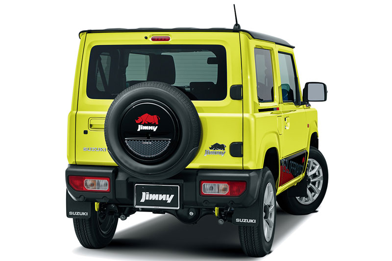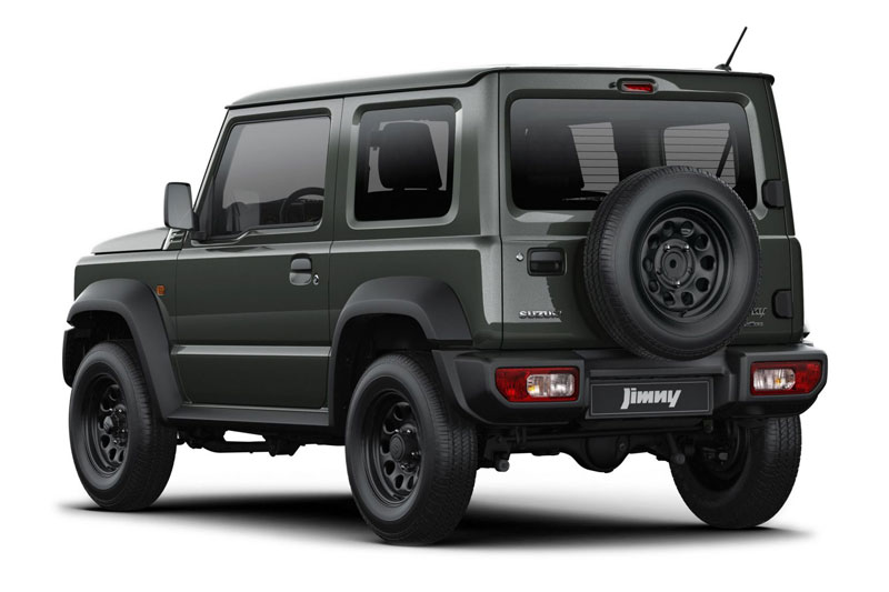 Cản trước được thiết kế nhô cao nhằm tối ưu góc tiếp cận địa hình, trong khi phần hông xe nổi bật với vòm bánh mở rộng và ốp chắn bùn đen mờ, kết hợp bộ mâm hợp kim 15 inch cùng lốp địa hình chuyên dụng. Phần đuôi xe với lốp dự phòng gắn trên cửa sau bản lề ngang vẫn là đặc điểm nhận diện quen thuộc của Jimny, mang đậm phong cách off-road.