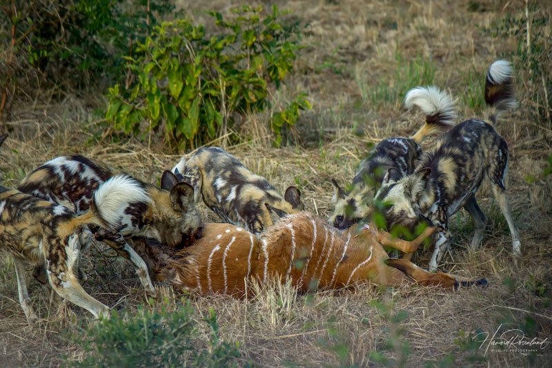 Một bầy chó hoang châu Phi thường có từ 10 - 20 cá thể, trong đó vai trò săn mồi được phân chia khá rõ ràng. Khi bắt đầu một cuộc đi săn, cả bầy thường chọn những con mồi yếu, già hoặc non trẻ trong đàn linh dương, ngựa vằn hay đôi khi cả trâu rừng. Chúng hiếm khi tấn công trực diện con mồi khỏe mạnh mà chủ yếu tận dụng sự đồng bộ để dồn ép và tách mục tiêu ra khỏi đàn.
