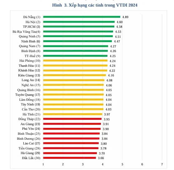Trong số 30 địa phương được lựa chọn để đánh giá về năng lực phát triển du lịch, Đà Nẵng tiếp tục khẳng định vị thế dẫn đầu với số điểm 4,89. Hà Nội và TP Hồ Chí Minh lần lượt đứng thứ hai và ba với điểm số 4,6 và 4,58. Các địa phương còn lại trong tốp 10 gồm: Bà Rịa - Vũng Tàu (4,53 điểm), Quảng Ninh (4,51 điểm), Ninh Bình (4,47 điểm), Quảng Nam (4,27 điểm), Bình Định (4,26 điểm), Thừa Thiên - Huế (4,25 điểm) và Hải Phòng (4,24 điểm).