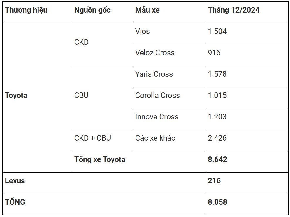 Trong tháng cuối năm 2025, TMV đã bàn giao 8.642 xe Toyota trên toàn quốc, bao gồm 2.790 xe lắp ráp trong nước (CKD) và 5.852 xe nhập khẩu nguyên chiếc (CBU). Doanh số xe hybrid đạt 861 chiếc, nâng tổng doanh số dòng xe này trong năm 2024 lên 5.350 chiếc.