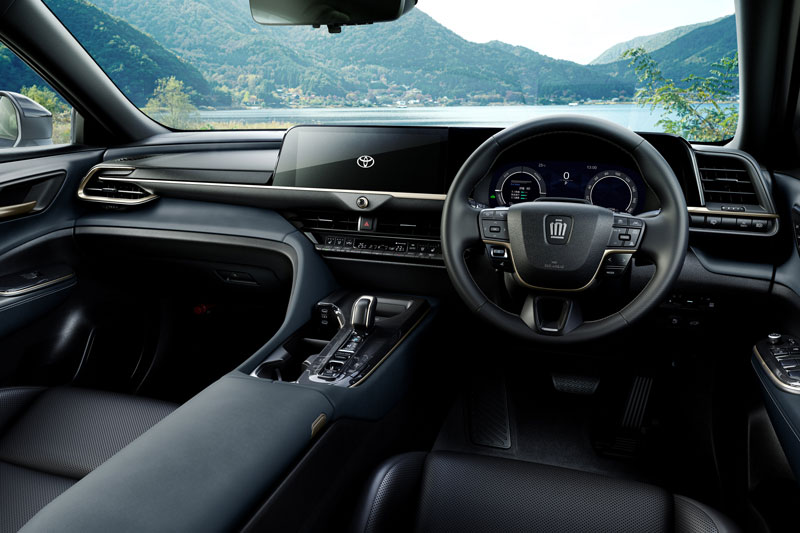 Bước vào khoang nội thất, Crown Estate mang đến không gian sang trọng với hai tùy chọn bọc da cao cấp màu đen hoặc nâu rám nắng. Vô-lăng đa chức năng và bộ chọn hộp số cũng được bọc da, đi kèm màn hình giải trí 12,3 inch, đảm bảo trải nghiệm lái hiện đại.