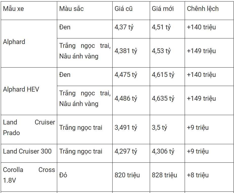 Với Land Cruiser LC300 và Land Cruiser Prado, giá khởi điểm không thay đổi, nhưng phiên bản màu trắng ngọc trai sẽ tăng thêm 9 triệu đồng. Sau điều chỉnh, giá của hai mẫu xe này lần lượt là 4,306 tỷ đồng và 3,5 tỷ đồng.