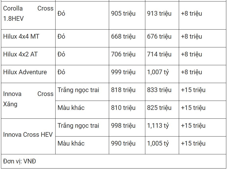 Ở nhóm xe phổ thông, Toyota Corolla Cross và Hilux giữ nguyên giá niêm yết, ngoại trừ phiên bản màu đỏ (mã màu 3U5). Màu này sẽ được xếp vào nhóm màu đặc biệt (tương tự trắng ngọc trai) với mức tăng giá 8 triệu đồng.