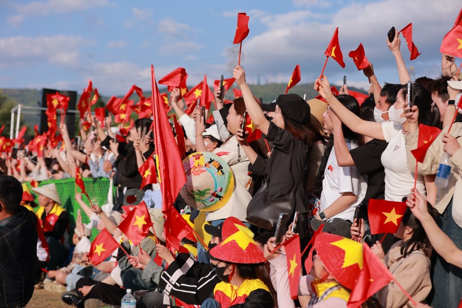 Giữa không gian rực rỡ cờ hoa với những lá cờ đỏ sao vàng tung bay trong tay người Việt tại Nhật, tiếng hát “Quốc ca” hào sảng, hùng tráng vang lên giữa lòng nước Nhật như tiếng gọi từ quê hương, như nhịp đập chung của hàng nghìn trái tim cùng hướng về đất mẹ, thôi thúc mọi người cùng hòa giọng.