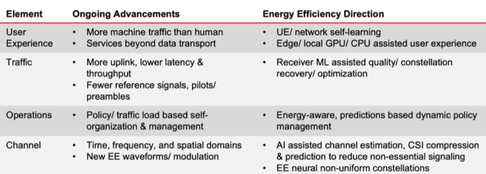 Để đạt được những yêu cầu cao này, mạng 6G cần hoạt động hiệu quả hơn trên tất cả các lớp — từ lớp vật lý đến các cấu phần, vận hành và ứng dụng. Những cải tiến hiệu suất toàn diện này sẽ giúp nâng cao hiệu suất năng lượng cao hơn (Bảng 1).