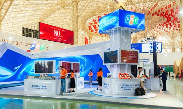 Tại gian hàng Quốc gia AI của FPT, khách tham quan có thể trải nghiệm cách AI đang thay đổi mọi khía cạnh kinh tế xã hội và cuộc sống, giải phóng con người khỏi các công việc lặp lại, thúc đẩy năng suất lao động và vận hành hiệu quả cho mọi tổ chức, doanh nghiệp. Nhiều giải pháp, ứng dụng công nghệ tiêu biểu AI được FPT giới thiệu như trợ lý số AI agents trong quản trị, vận hành, giám sát ; Smart AI Cabin - buồng lái AI thông minh trong công nghệ ô tô; Qaidora AI - vision và camera AI giám sát an ninh...