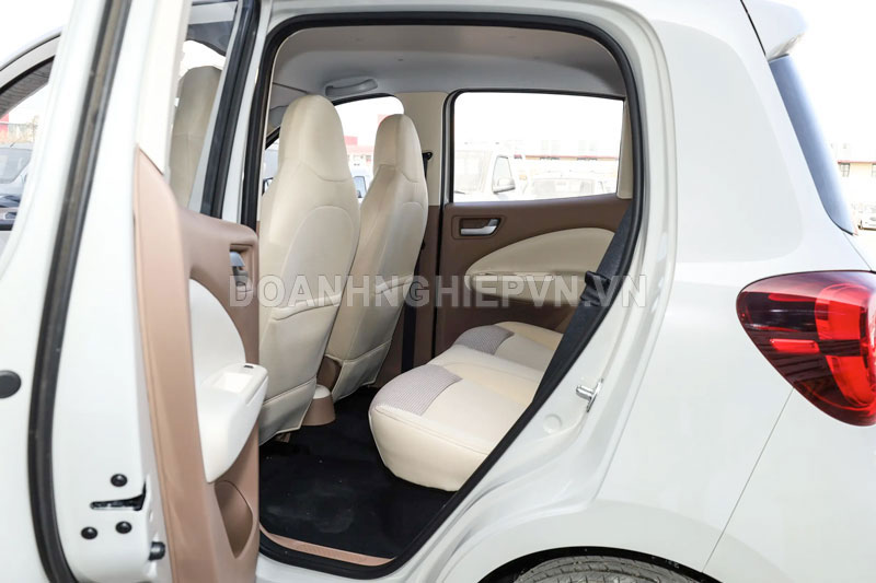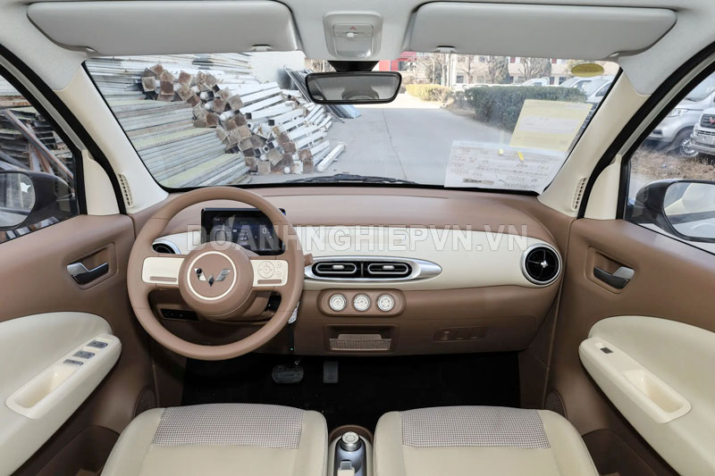 Bên trong cabin, Hongguang Mini EV 4 cửa sử dụng tông màu kem caramel kết hợp với nâu socola và trắng phô mai, tạo cảm giác ấm áp và sang trọng. Xe được trang bị màn hình điều khiển trung tâm nổi 8 inch cùng màn hình cụm đồng hồ LCD màu 7 inch, hỗ trợ các tính năng như gọi điện thoại Bluetooth, phát nhạc, camera lùi, radar lùi, giúp người lái dễ dàng thao tác và quan sát.