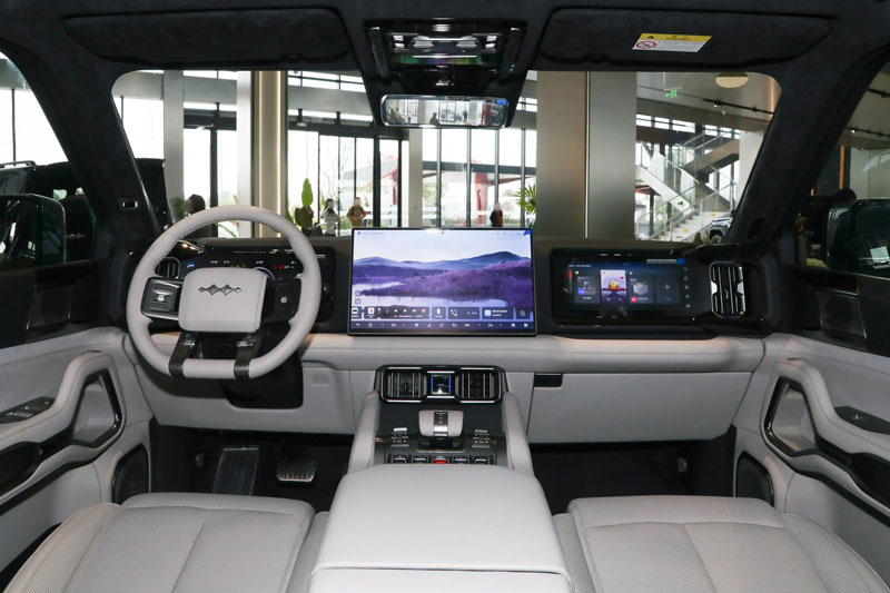 Khoang nội thất của Leopard 8 2025 bản 5 chỗ được thiết kế để tối ưu sự thoải mái cho hành khách. Hàng ghế thứ hai nay có chỗ để chân điều chỉnh bốn hướng, mang đến trải nghiệm thư giãn gần tương đương hạng thương gia. Toàn bộ bảng điều khiển trung tâm áp dụng phong cách thiết kế hiện đại, tương tự các mẫu xe thuộc dòng Formula Leopard, với cụm đồng hồ kỹ thuật số 12,3 inch, màn hình điều khiển trung tâm 17,3 inch, màn hình phụ 12,3 inch cho hành khách và màn hình hiển thị thông tin trên kính lái AR-HUD 50 inch.
