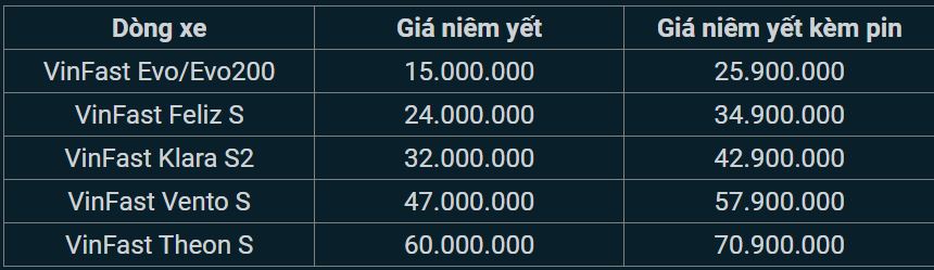Mức giá tương ứng dành cho các mẫu xe Feliz S, Klara S2, Vento S và Theon S theo hình thức thuê pin lần lượt là từ 24 triệu, 32 triệu, 47 triệu và 60 triệu đồng, thấp hơn đáng kể so với các mẫu xe máy xăng cùng phân khúc, có chất lượng và khả năng vận hành tương đương.