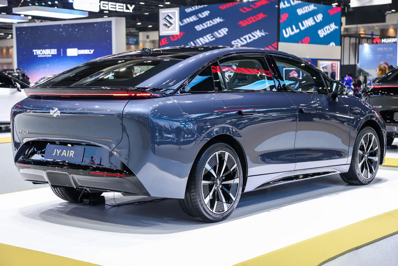 JY Air EV gây ấn tượng ngay từ cái nhìn đầu tiên với cụm đèn pha hình chữ C gồm 240 bóng LED, mô phỏng ánh sáng ở đầu cánh máy bay phản lực. Đường mái rộng tạo cảm giác như đường chân trời trong những chuyến bay đêm, trong khi phần đuôi xe được trang bị đèn hậu OLED toàn chiều rộng, được tích hợp tinh tế dưới kính chắn gió phía sau. Không chỉ đẹp mắt, thiết kế này còn giúp xe có hệ số cản gió chỉ 0,23, tối ưu khả năng vận hành.