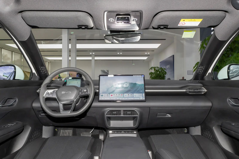 Khoang nội thất BYD e7 mang phong cách công nghệ hiện đại, nổi bật với màn hình cảm ứng trung tâm 15,6 inch, bảng đồng hồ kỹ thuật số LCD 5 inch và vô lăng đáy phẳng thời thượng. Giao diện người dùng được vận hành bởi hệ điều hành DiLink 100 do BYD phát triển đem lại trải nghiệm mượt mà và thông minh.