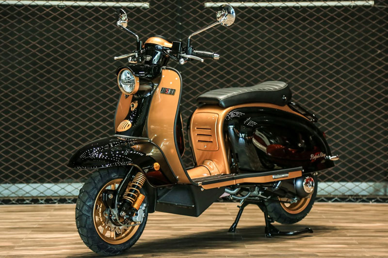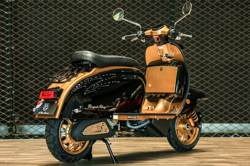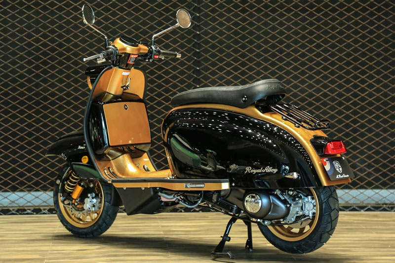 Royal Alloy JPS 350 gây ấn tượng mạnh ngay từ cái nhìn đầu tiên với kiểu dáng gần như “sao y” từ thiết kế nguyên bản của Lambretta cổ điển. Toàn bộ thân xe và khung gầm đều được chế tạo bằng thép tấm thay vì nhựa, tạo cảm giác chắc chắn, bền bỉ và mang đậm hơi thở hoài cổ.